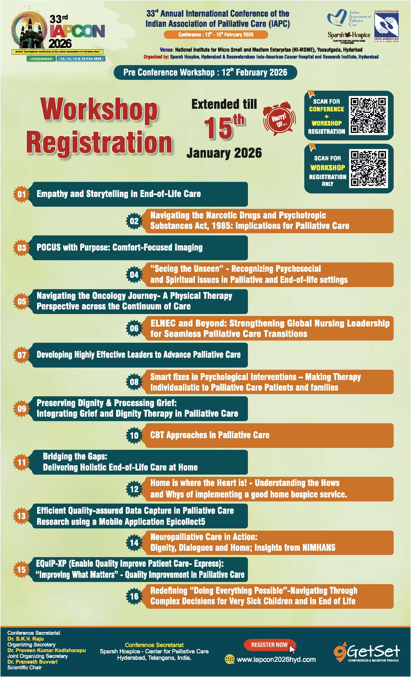 This prestigious conference is being organized by Sparsh Hospice – Centre for Palliative Care and Basavatarakam Indo American Cancer Hospital & Research Institute at the National Institute for Micro, Small, and Medium Enterprise (NI-MSME), Hyderabad, from 13th to 15th February 2026. The pre-conference workshops are scheduled to be held on 12th February, 2026.